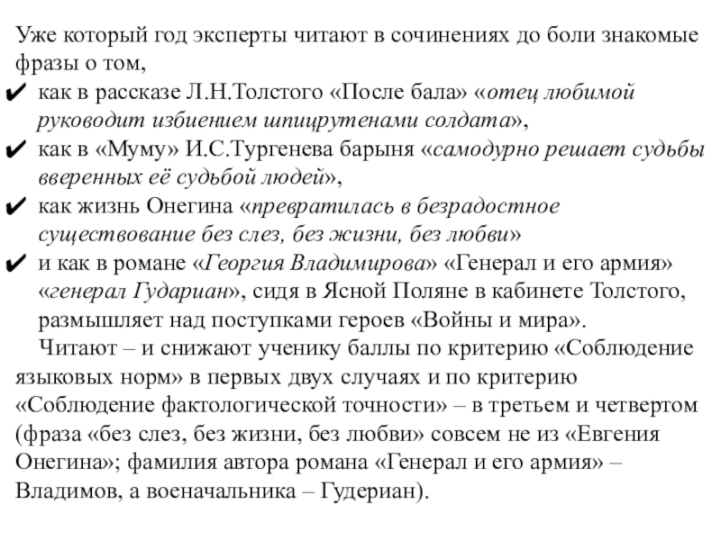 Читают – и снижают ученику баллы по критерию «Соблюдение языковых норм» в первых двух случаях и по критерию «Соблюдение фактологической точности» – в третьем и четвертом (фраза «без слез, без жизни, без любви» совсем не из «Евгения Онегина»; фамилия автора романа «Генерал и его армия» – Владимов, а военачальника – Гудериан).