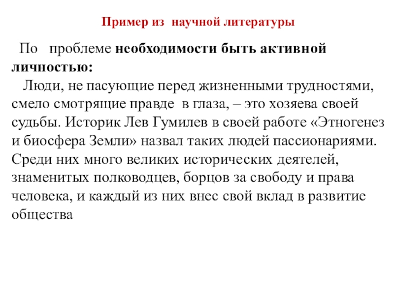 пасующие перед жизненными трудностями, смело смотрящие правде в глаза, – это хозяева своей судьбы. Историк Лев Гумилев в своей работе «Этногенез и биосфера Земли» назвал таких людей пассионариями. Среди них много великих исторических деятелей, знаменитых полководцев, борцов за свободу и права человека, и каждый из них внес свой вклад в развитие общества