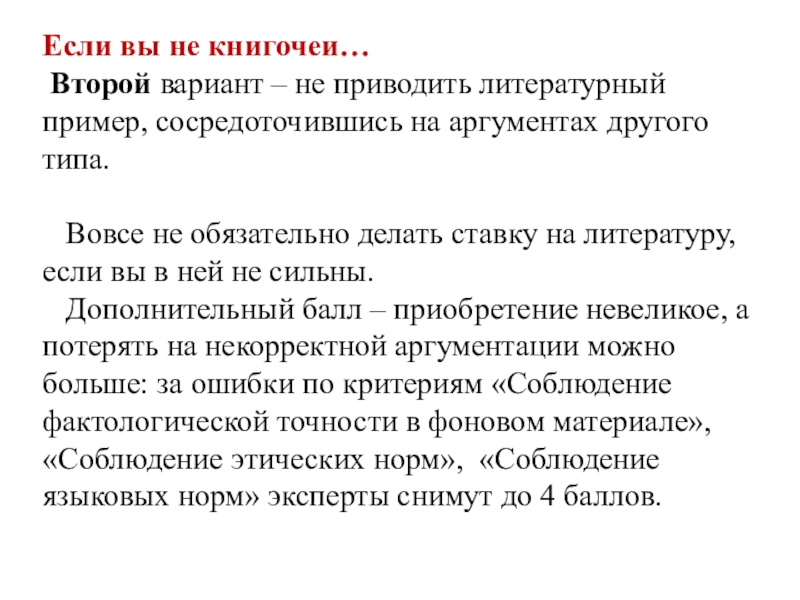 Дополнительный балл – приобретение невеликое, а потерять на некорректной аргументации можно больше: за ошибки по критериям «Соблюдение фактологической точности в фоновом материале», «Соблюдение этических норм», «Соблюдение языковых норм» эксперты снимут до 4 баллов.