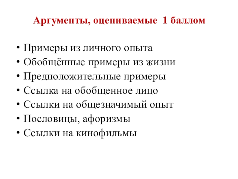 Все остальные аргументы, а также цитирование пословиц поговорок, афоризмов оценивается 1 баллом.