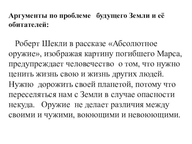 Шекли в рассказе «Абсолютное оружие», изображая картину погибшего Марса, предупреждает человечество о том, что нужно ценить жизнь свою и жизнь других людей. Нужно дорожить своей планетой, потому что переселяться нам с Земли в случае опасности некуда. Оружие не делает различия между своими и чужими, воюющими и невоюющими.