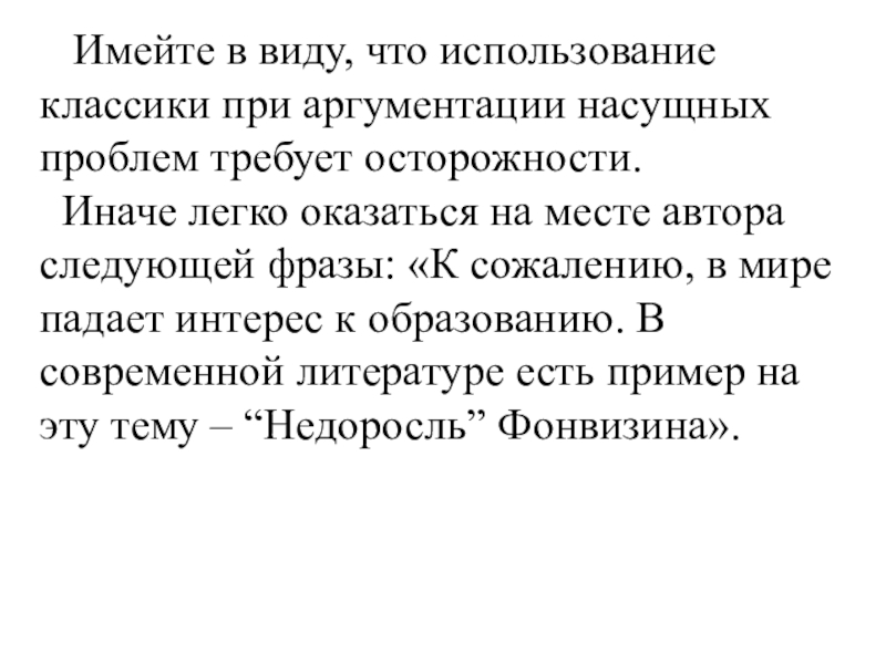 Слайд 13 Имейте в виду, что использование классики при аргументации насущных