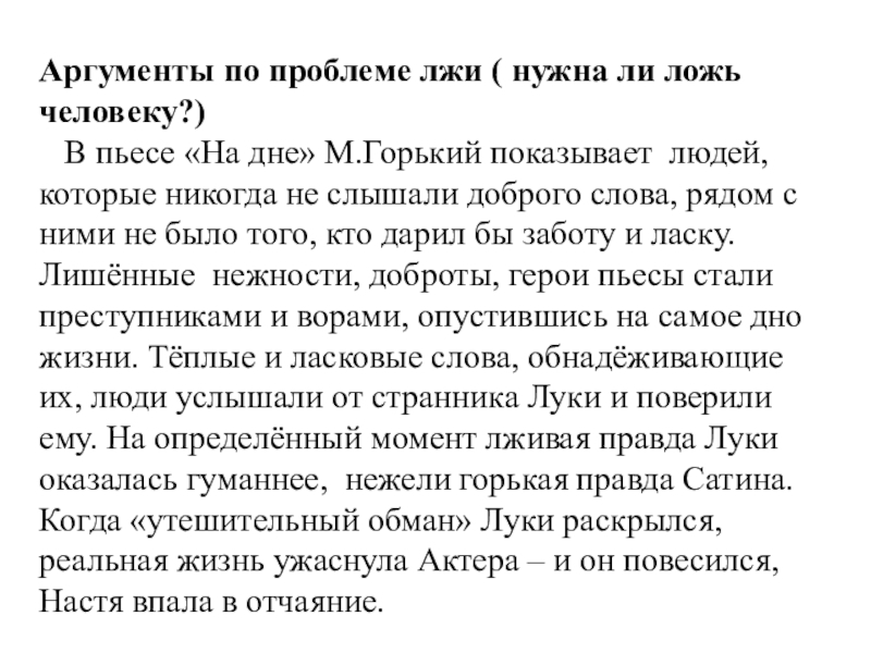 пьесе «На дне» М.Горький показывает людей, которые никогда не слышали доброго слова, рядом с ними не было того, кто дарил бы заботу и ласку. Лишённые нежности, доброты, герои пьесы стали преступниками и ворами, опустившись на самое дно жизни. Тёплые и ласковые слова, обнадёживающие их, люди услышали от странника Луки и поверили ему. На определённый момент лживая правда Луки оказалась гуманнее, нежели горькая правда Сатина. Когда «утешительный обман» Луки раскрылся, реальная жизнь ужаснула Актера – и он повесился, Настя впала в отчаяние.