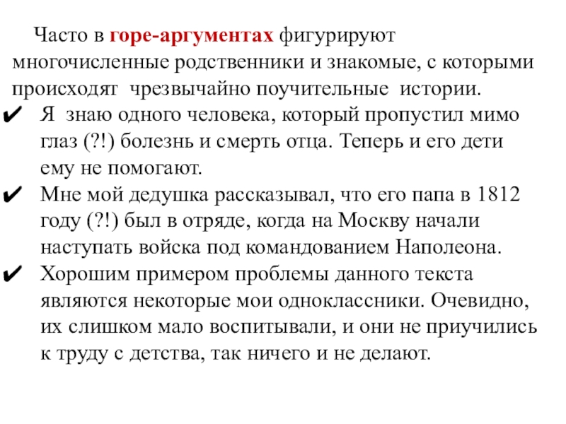 Слайд 27 Часто в горе-аргументах фигурируют многочисленные родственники и знакомые, с