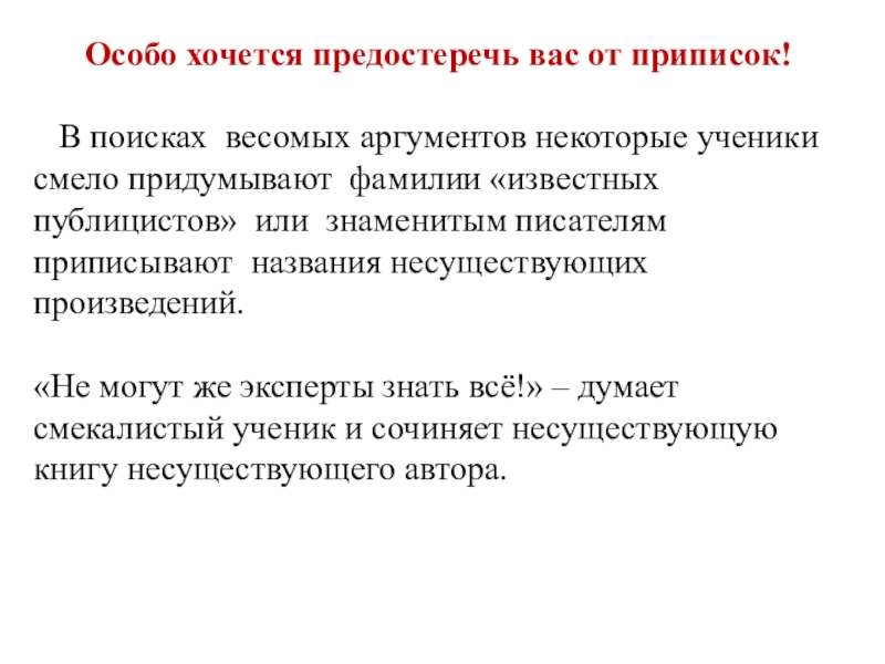 В поисках весомых аргументов некоторые ученики смело придумывают фамилии «известных публицистов» или знаменитым писателям приписывают названия несуществующих произведений.