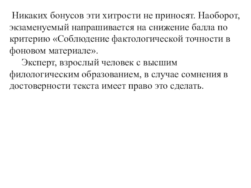 Слайд 15 Никаких бонусов эти хитрости не приносят. Наоборот, экзаменуемый напрашивается на