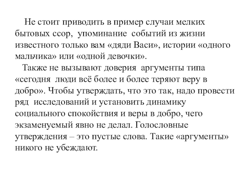 Также не вызывают доверия аргументы типа «сегодня люди всё более и более теряют веру в добро». Чтобы утверждать, что это так, надо провести ряд исследований и установить динамику социального спокойствия и веры в добро, чего экзаменуемый явно не делал. Голословные утверждения – это пустые слова. Такие «аргументы» никого не убеждают.
