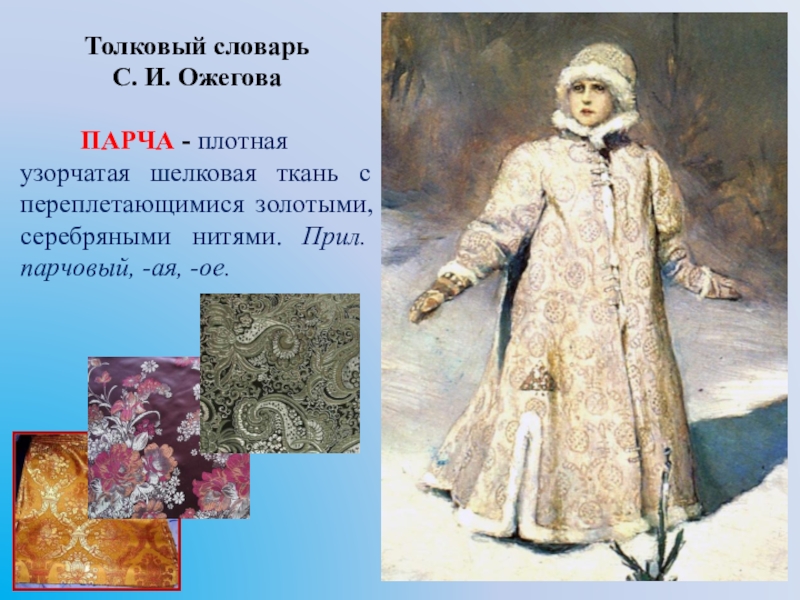 Толковый словарь C. И. Ожегова       ПАРЧА - плотная узорчатая шелковая ткань