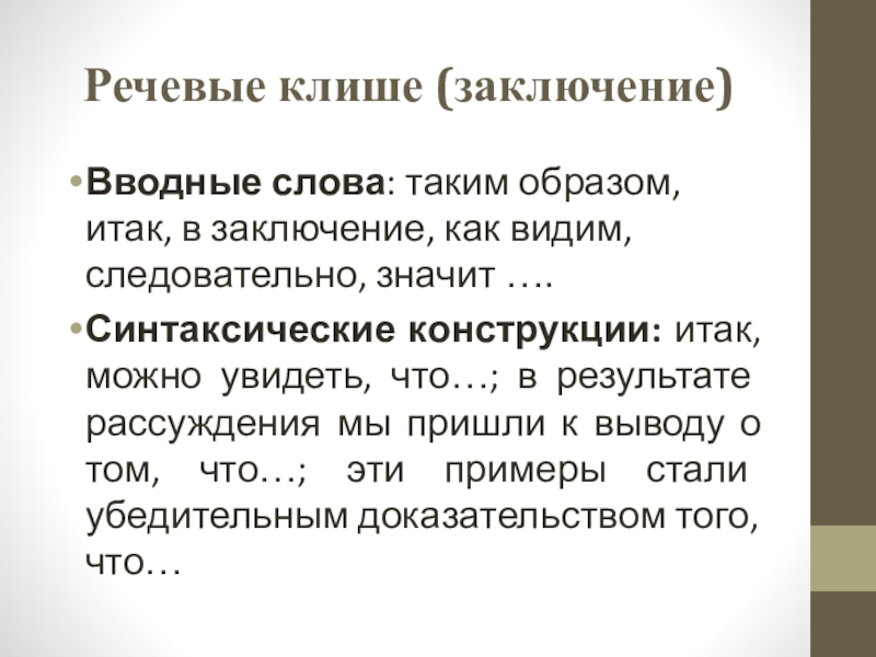 Синтаксические конструкции: итак, можно увидеть, что…; в результате рассуждения мы пришли к выводу о том, что…; эти примеры стали убедительным доказательством того, что…