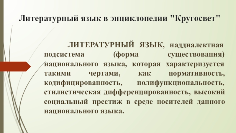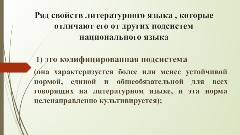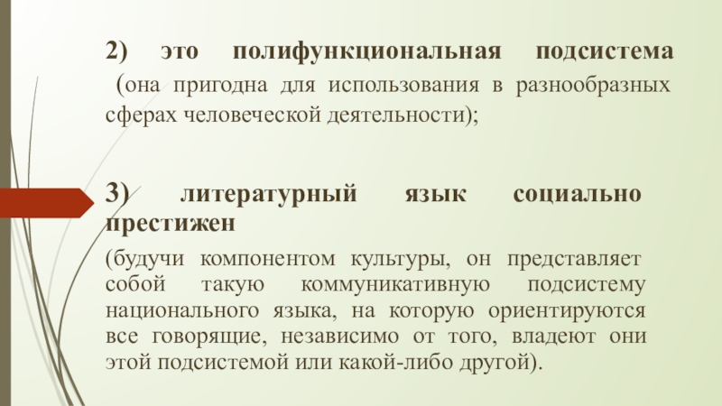 (будучи компонентом культуры, он представляет собой такую коммуникативную подсистему национального языка, на которую ориентируются все говорящие, независимо от того, владеют они этой подсистемой или какой-либо другой).