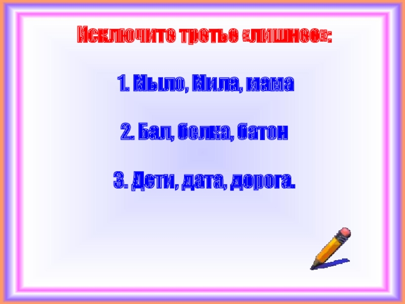 Исключите третье «лишнее»: 1. Мыло, Мила, мама2. Бал, белка, батон3. Дети, дата, дорога.