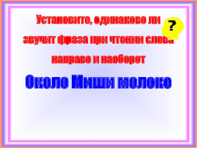 Установите, одинаково ли звучит фраза при чтении слева направо и наоборотОколо Миши молоко
