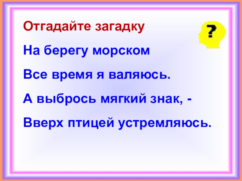 Отгадайте загадкуНа берегу морскомВсе время я валяюсь.А выбрось мягкий знак, - Вверх птицей устремляюсь.