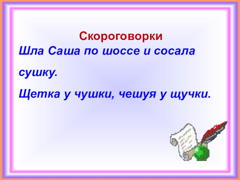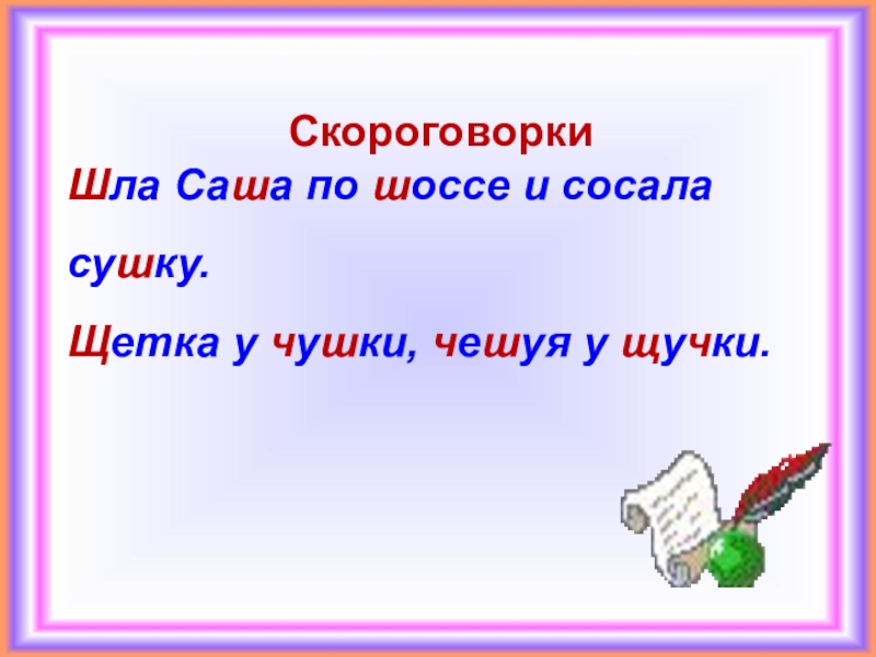 СкороговоркиШла Саша по шоссе и сосала сушку.Щетка у чушки, чешуя у щучки.