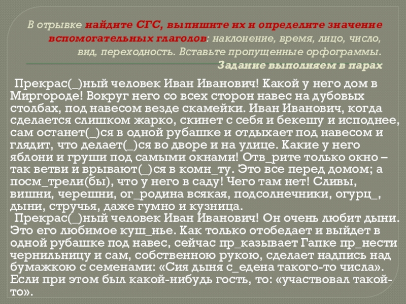 Прекрас(_)ный человек Иван Иванович! Он очень любит дыни. Это его любимое куш_нье. Как только отобедает и выйдет в одной рубашке под навес, сейчас пр_казывает Гапке пр_нести чернильницу и сам, собственною рукою, сделает надпись над бумажкою с семенами: «Сия дыня с_едена такого-то числа». Если при этом был какой-нибудь гость, то: «участвовал такой-то».