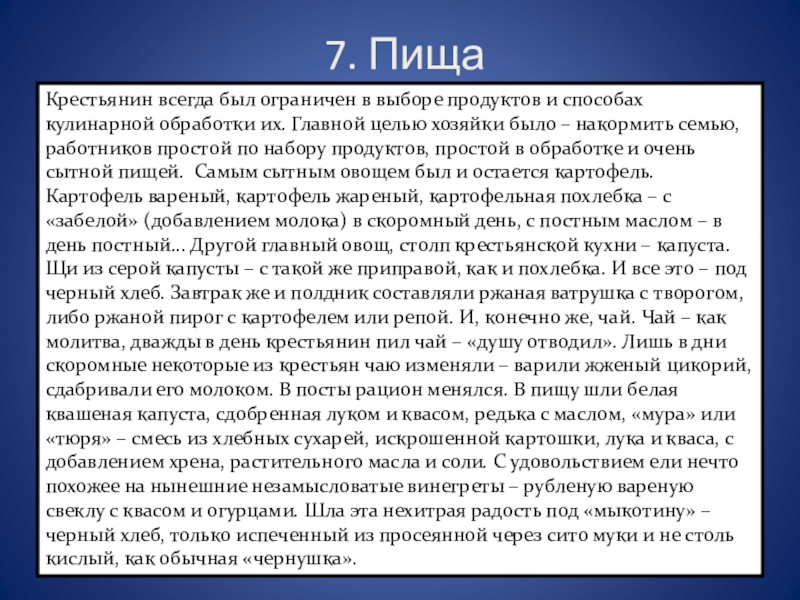 обработки их. Главной целью хозяйки было – накормить семью, работников простой по набору продуктов, простой в обработке и очень сытной пищей. Самым сытным овощем был и остается картофель. Картофель вареный, картофель жареный, картофельная похлебка – с «забелой» (добавлением молока) в скоромный день, с постным маслом – в день постный... Другой главный овощ, столп крестьянской кухни – капуста. Щи из серой капусты – с такой же приправой, как и похлебка. И все это – под черный хлеб. Завтрак же и полдник составляли ржаная ватрушка с творогом, либо ржаной пирог с картофелем или репой. И, конечно же, чай. Чай – как молитва, дважды в день крестьянин пил чай – «душу отводил». Лишь в дни скоромные некоторые из крестьян чаю изменяли – варили жженый цикорий, сдабривали его молоком. В посты рацион менялся. В пищу шли белая квашеная капуста, сдобренная луком и квасом, редька с маслом, «мура» или «тюря» – смесь из хлебных сухарей, искрошенной картошки, лука и кваса, с добавлением хрена, растительного масла и соли. С удовольствием ели нечто похожее на нынешние незамысловатые винегреты – рубленую вареную свеклу с квасом и огурцами. Шла эта нехитрая радость под «мыкотину» – черный хлеб, только испеченный из просеянной через сито муки и не столь кислый, как обычная «чернушка».