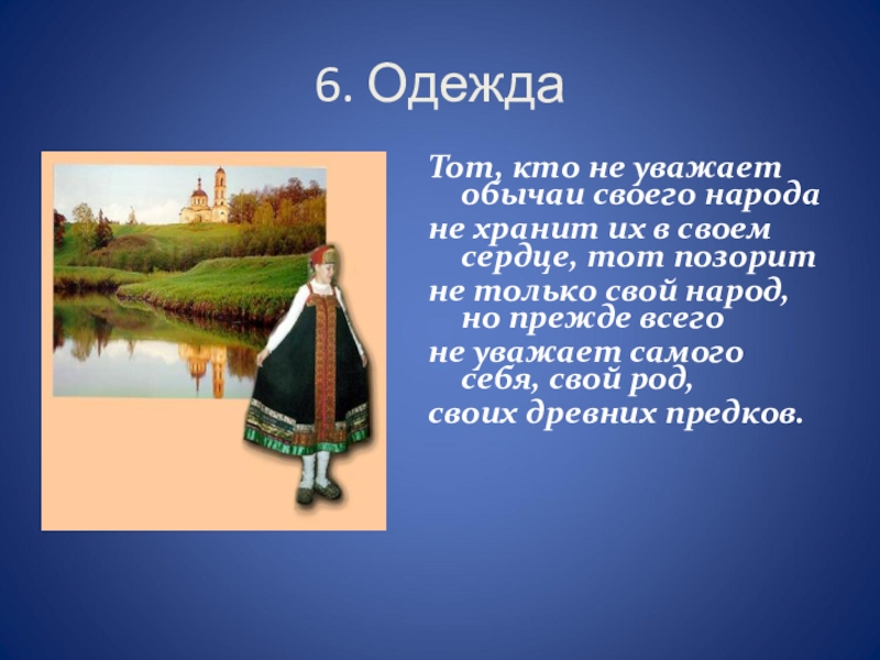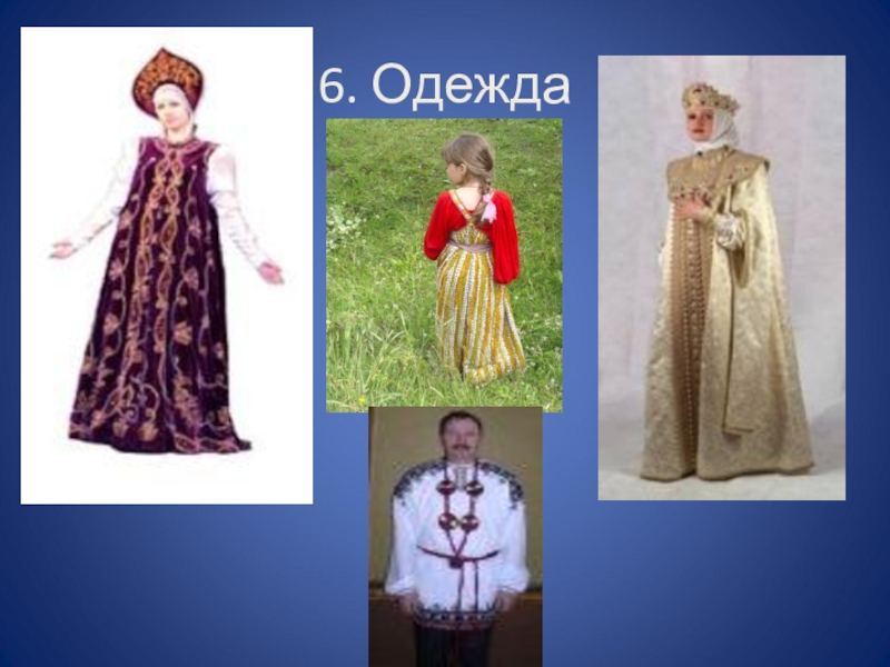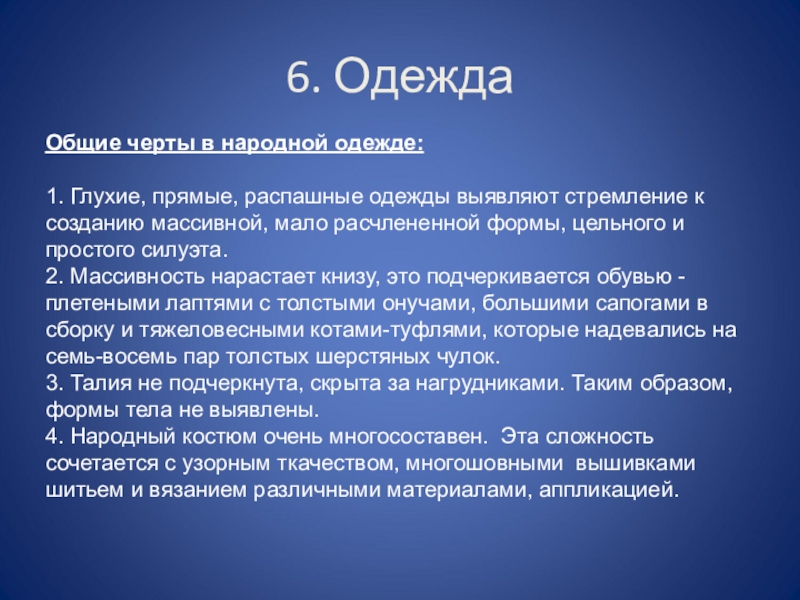 4. Народный костюм очень многосоставен. Эта сложность сочетается с узорным ткачеством, многошовными вышивками шитьем и вязанием различными материалами, аппликацией.
