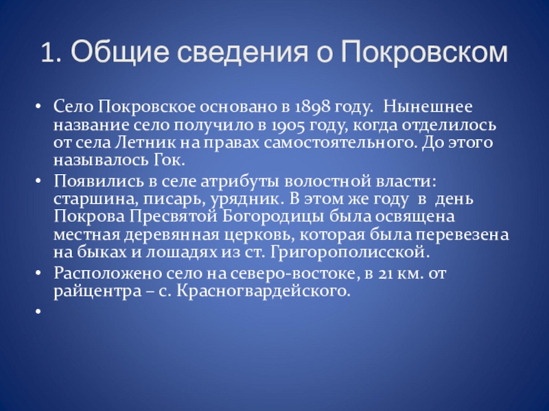км.2 Село расположено на открытой местности вдоль берега реки Большой Гок. Основано переселенцами из Орловской, Смоленской, Воронежской, Рязанской губерний в 1898 году.