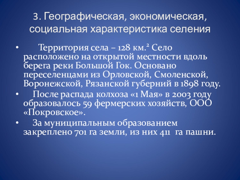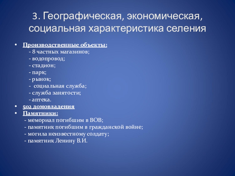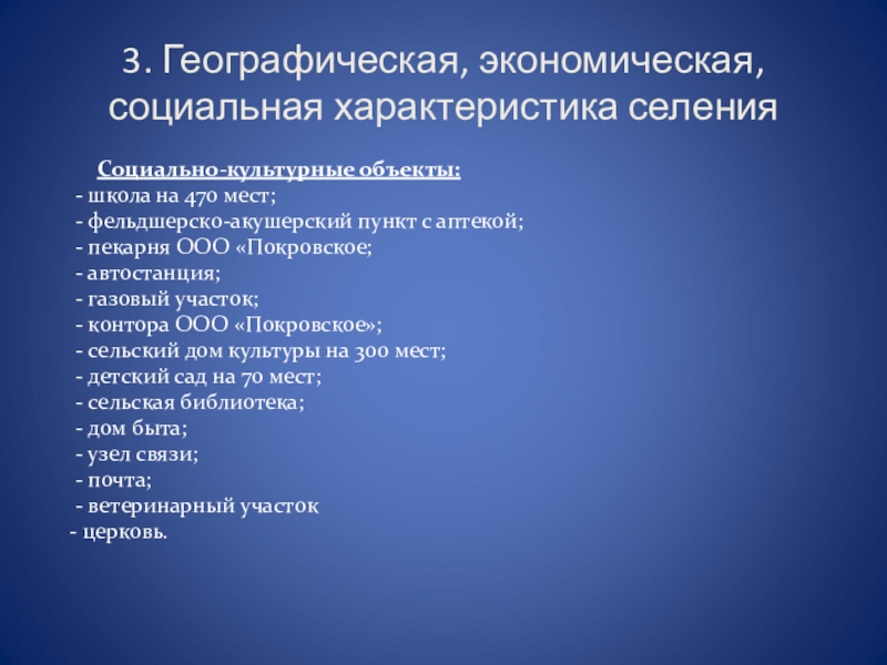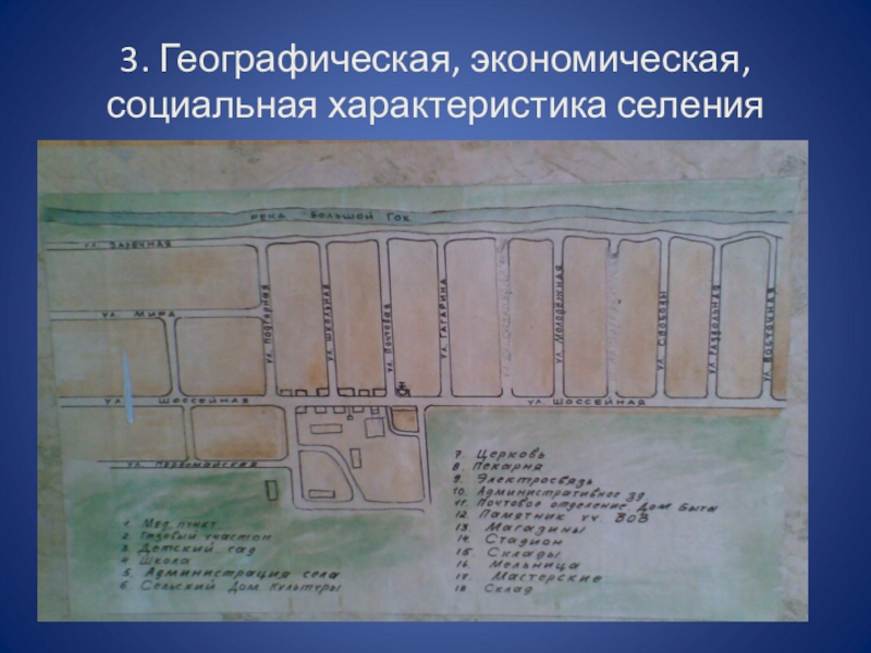 Слайд 173. Географическая, экономическая, социальная характеристика селения