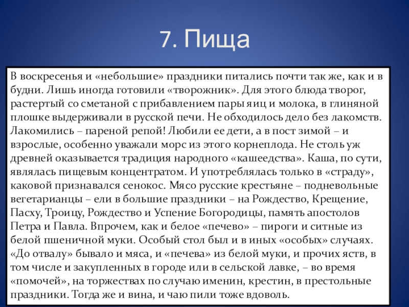 и в будни. Лишь иногда готовили «творожник». Для этого блюда творог, растертый со сметаной с прибавлением пары яиц и молока, в глиняной плошке выдерживали в русской печи. Не обходилось дело без лакомств. Лакомились – пареной репой! Любили ее дети, а в пост зимой – и взрослые, особенно уважали морс из этого корнеплода. Не столь уж древней оказывается традиция народного «кашеедства». Каша, по сути, являлась пищевым концентратом. И употреблялась только в «страду», каковой признавался сенокос. Мясо русские крестьяне – подневольные вегетарианцы – ели в большие праздники – на Рождество, Крещение, Пасху, Троицу, Рождество и Успение Богородицы, память апостолов Петра и Павла. Впрочем, как и белое «печево» – пироги и ситные из белой пшеничной муки. Особый стол был и в иных «особых» случаях. «До отвалу» бывало и мяса, и «печева» из белой муки, и прочих яств, в том числе и закупленных в городе или в сельской лавке, – во время «помочей», на торжествах по случаю именин, крестин, в престольные праздники. Тогда же и вина, и чаю пили тоже вдоволь.