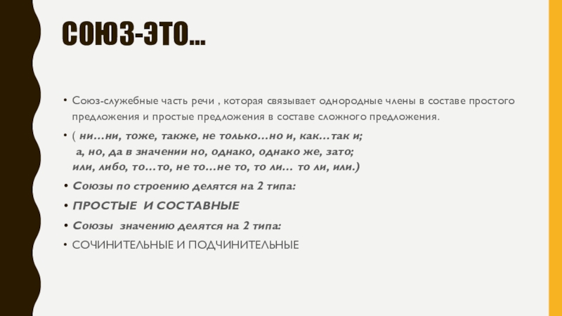 Союз-служебные часть речи , которая связывает однородные члены в составе простого