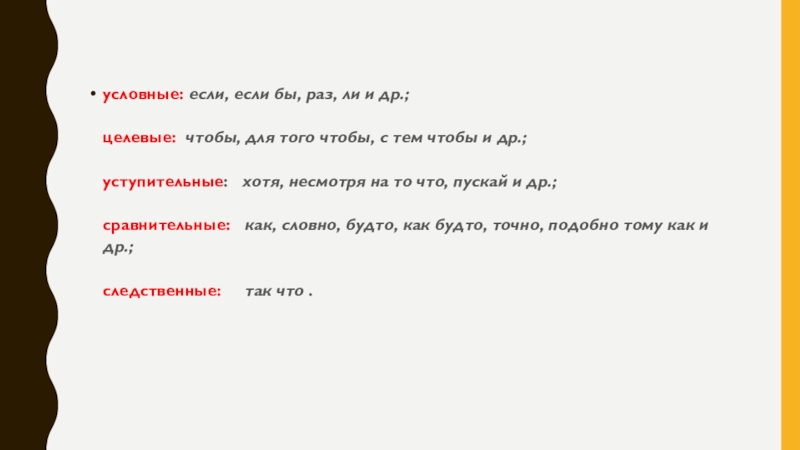 Слайд 6условные: если, если бы, раз, ли и др.;