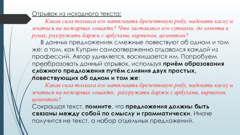 В данных предложениях смежные повествуют об одном и том же: о том, как Куприн самоотверженно отдавался каждой из профессий. Автор удивляется, восхищается им. Попробуем преобразовать данный отрывок, используя приём образования сложного предложения путём слияния двух простых, повествующих об одном и том же: