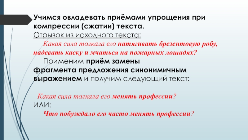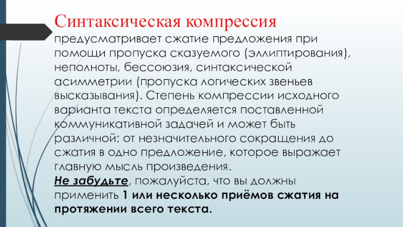 бессоюзия, синтаксической асимметрии (пропуска логических звеньев высказывания). Степень компрессии исходного варианта текста определяется поставленной коммуникативной задачей и может быть различной: от незначительного сокращения до сжатия в одно предложение, которое выражает главную мысль произведения.