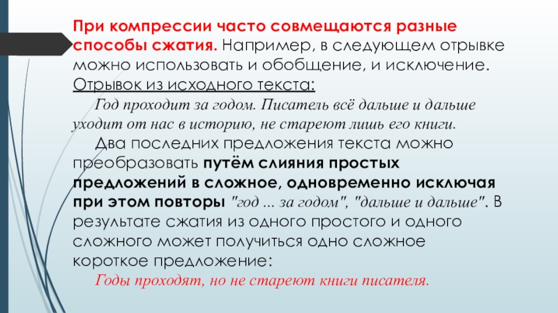 Слайд 13При компрессии часто совмещаются разные способы сжатия. Например, в следующем отрывке можно