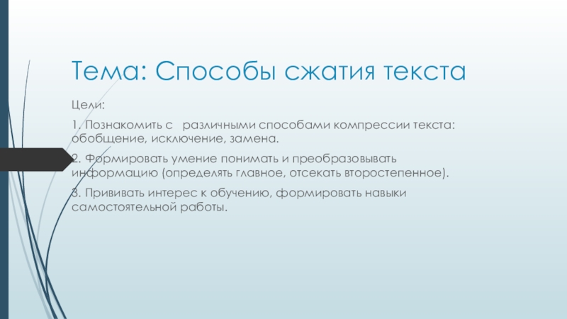 Сжатие – это преобразование, при котором текст заменяется более кратким по объему изложением, но с сохранением основных микротемю