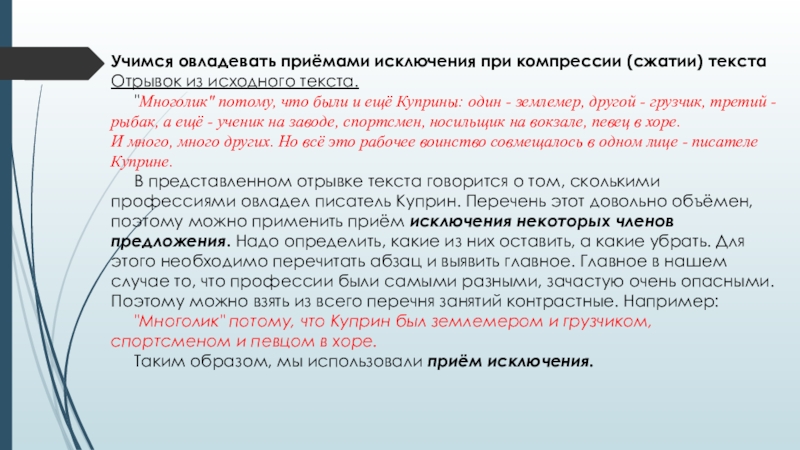 Слайд 19Учимся овладевать приёмами исключения при компрессии (сжатии) текста