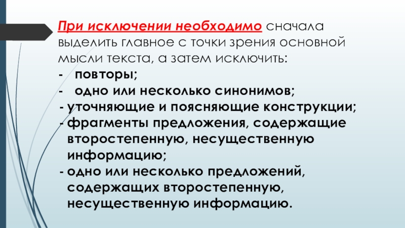 Слайд 7При исключении необходимо сначала выделить главное с точки зрения основной мысли текста,