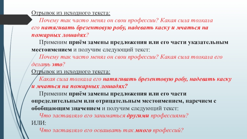 Применим приём замены предложения или его части определительным или отрицательным местоимением, наречием с обобщающим значением и получим следующий текст: