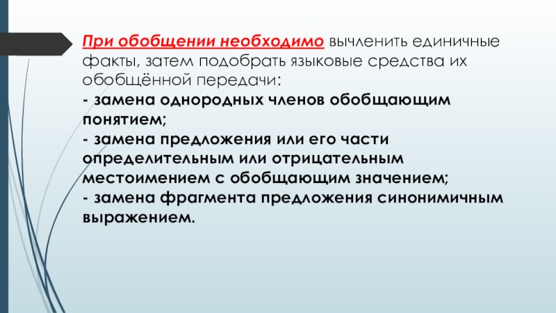 Слайд 9При обобщении необходимо вычленить единичные факты, затем подобрать языковые средства их обобщённой