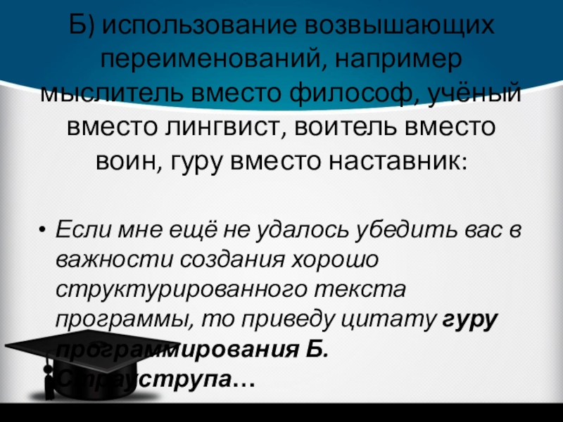 Слайд 14Б) использование возвышающих переименований, например мыслитель вместо философ, учёный вместо лингвист,
