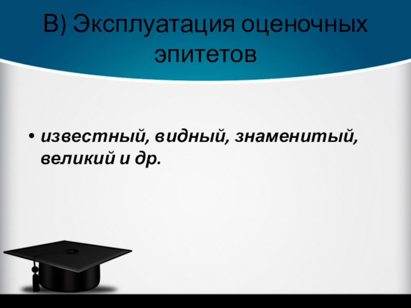 Слайд 15В) Эксплуатация оценочных эпитетов