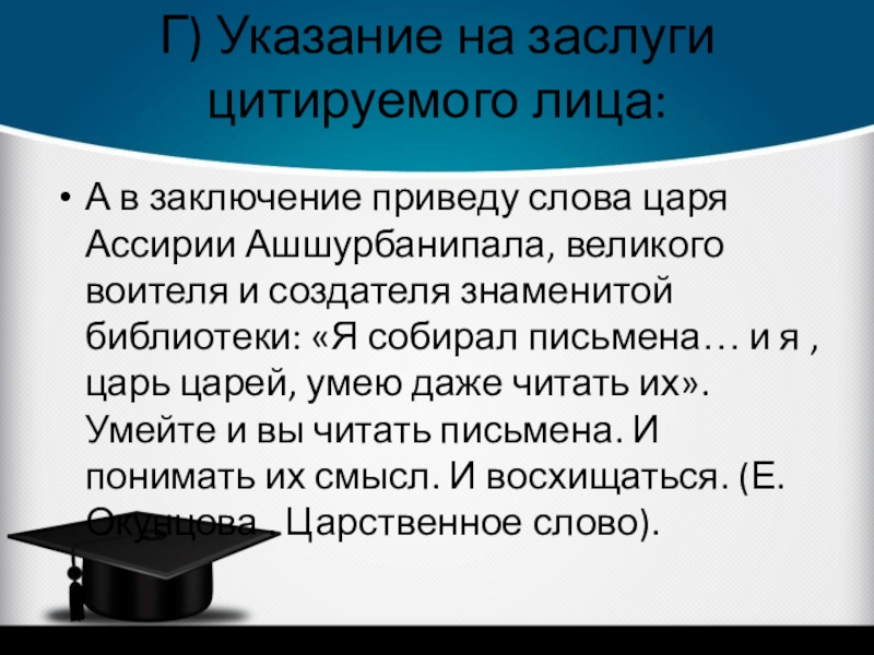 Слайд 16Г) Указание на заслуги цитируемого лица: