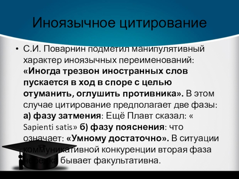 слов пускается в ход в споре с целью отуманить, оглушить противника». В этом случае цитирование предполагает две фазы: а) фазу затмения: Ещё Плавт сказал: « Sapienti satis» б) фазу пояснения: что означает: «Умному достаточно». В ситуации коммуникативной конкуренции вторая фаза нередка бывает факультативна.