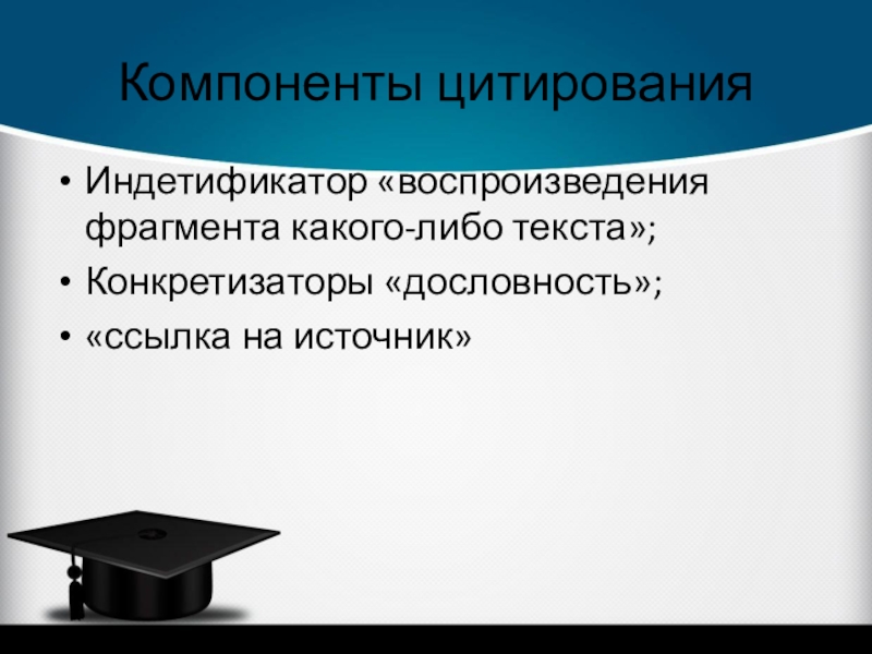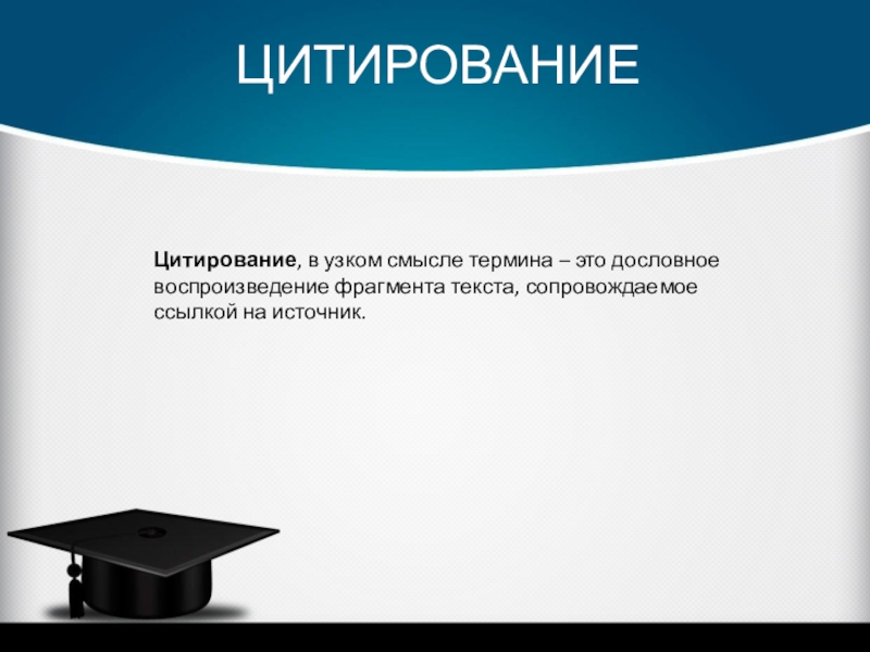Цитирование, в узком смысле термина – это дословное воспроизведение фрагмента текста,