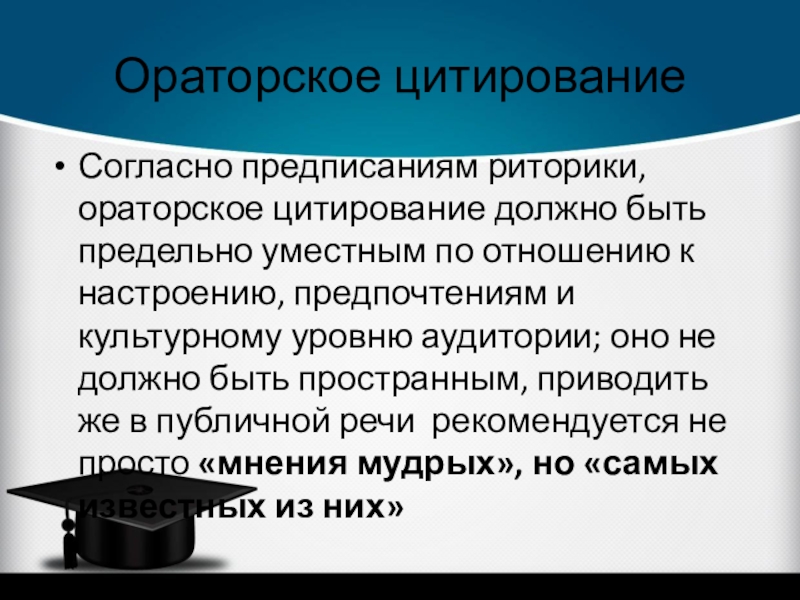 по отношению к настроению, предпочтениям и культурному уровню аудитории; оно не должно быть пространным, приводить же в публичной речи рекомендуется не просто «мнения мудрых», но «самых известных из них»