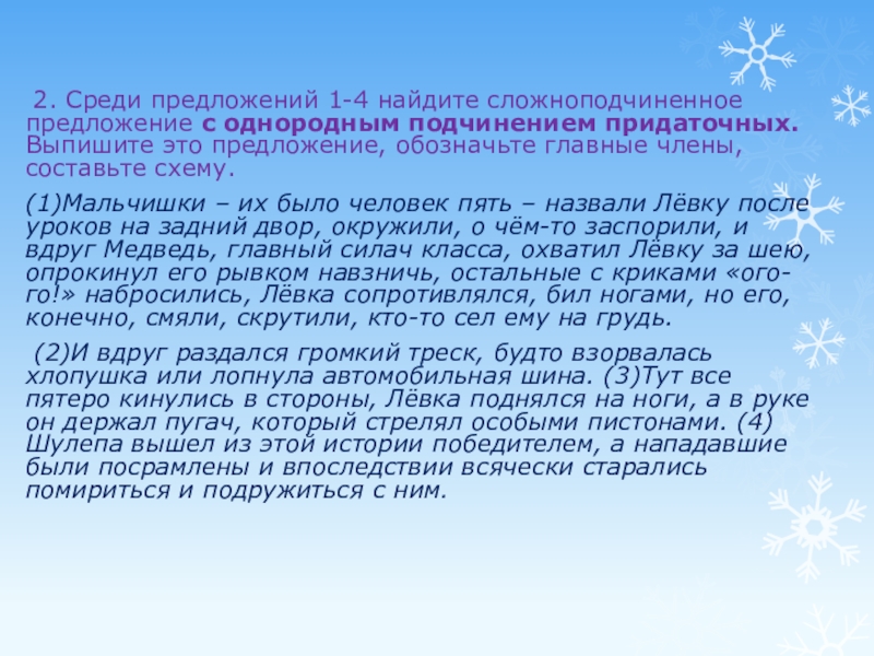 (2)И вдруг раздался громкий треск, будто взорвалась хлопушка или лопнула автомобильная шина. (3)Тут все пятеро кинулись в стороны, Лёвка поднялся на ноги, а в руке он держал пугач, который стрелял особыми пистонами. (4)Шулепа вышел из этой истории победителем, а нападавшие были посрамлены и впоследствии всячески старались помириться и подружиться с ним.