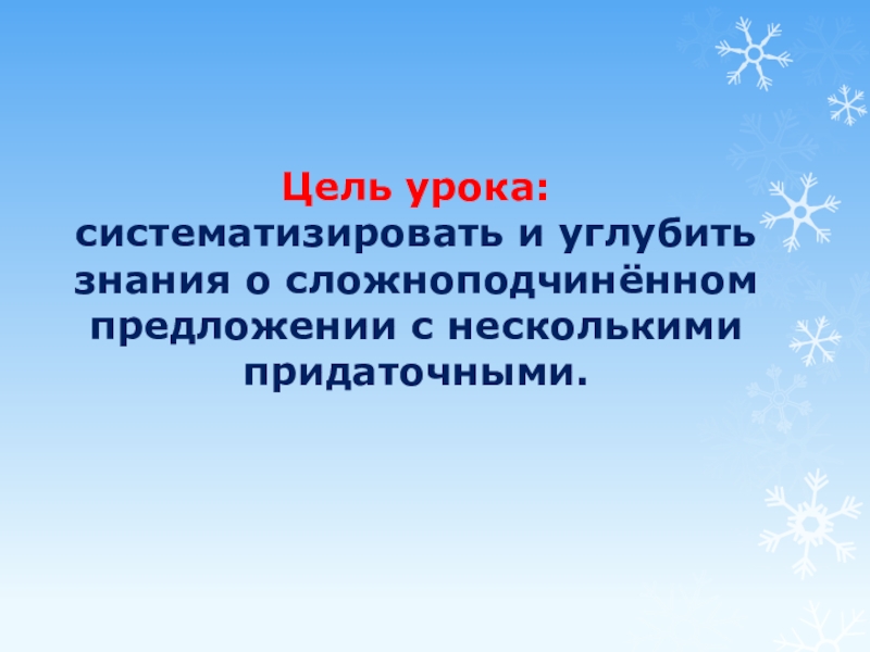 Слайд 6Цель урока: систематизировать и углубить знания о сложноподчинённом предложении с несколькими