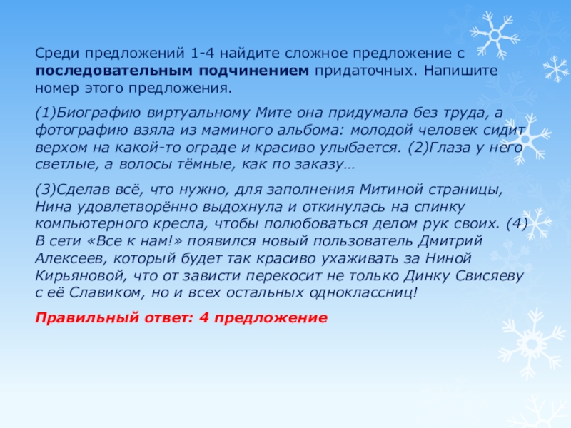 Слайд 10Среди предложений 1-4 найдите сложное предложение с последовательным подчинением придаточных. Напишите