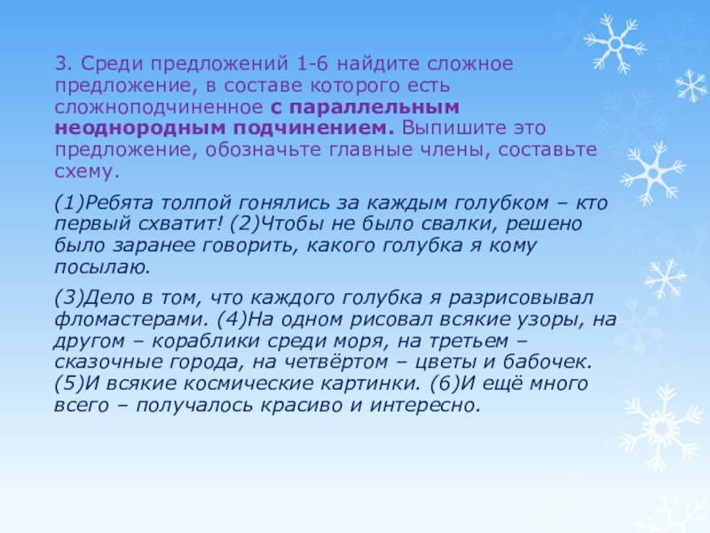 (3)Дело в том, что каждого голубка я разрисовывал фломастерами. (4)На одном рисовал всякие узоры, на другом – кораблики среди моря, на третьем – сказочные города, на четвёртом – цветы и бабочек. (5)И всякие космические картинки. (6)И ещё много всего – получалось красиво и интересно.