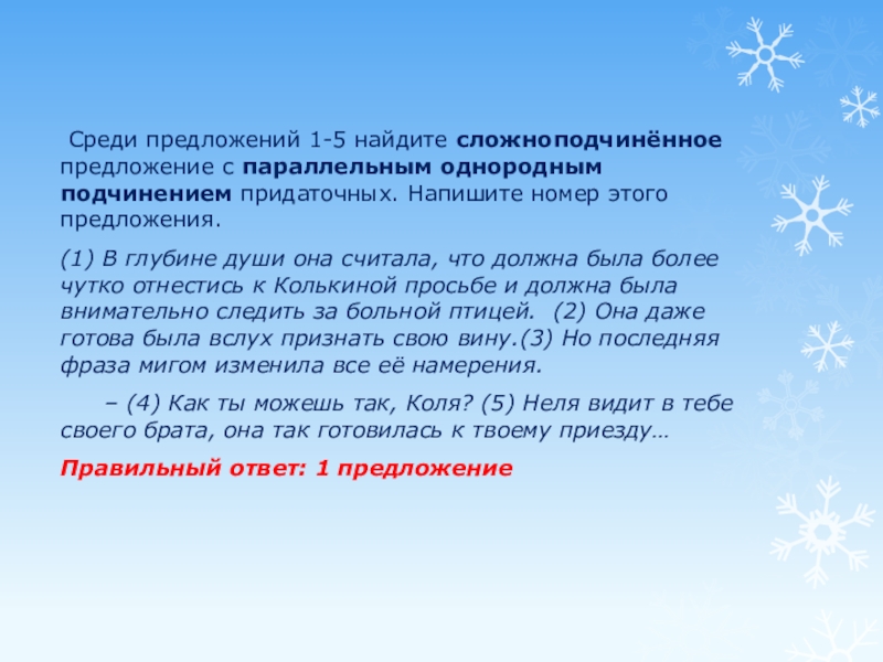 Слайд 11 Среди предложений 1-5 найдите сложноподчинённое предложение с параллельным однородным подчинением
