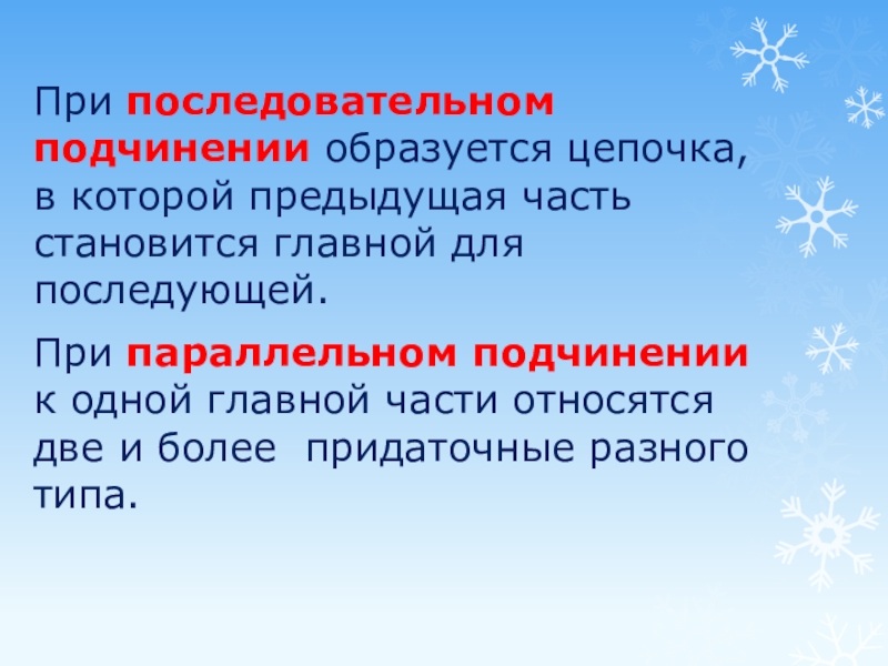 Слайд 4При последовательном подчинении образуется цепочка, в которой предыдущая часть становится главной