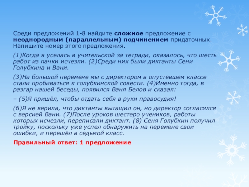 Слайд 12Среди предложений 1-8 найдите сложное предложение с неоднородным (параллельным) подчинением придаточных.