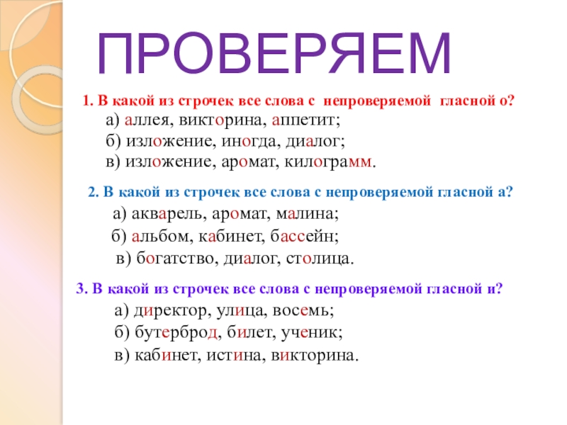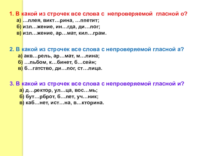 3. В какой из строчек все слова с непроверяемой гласной и?