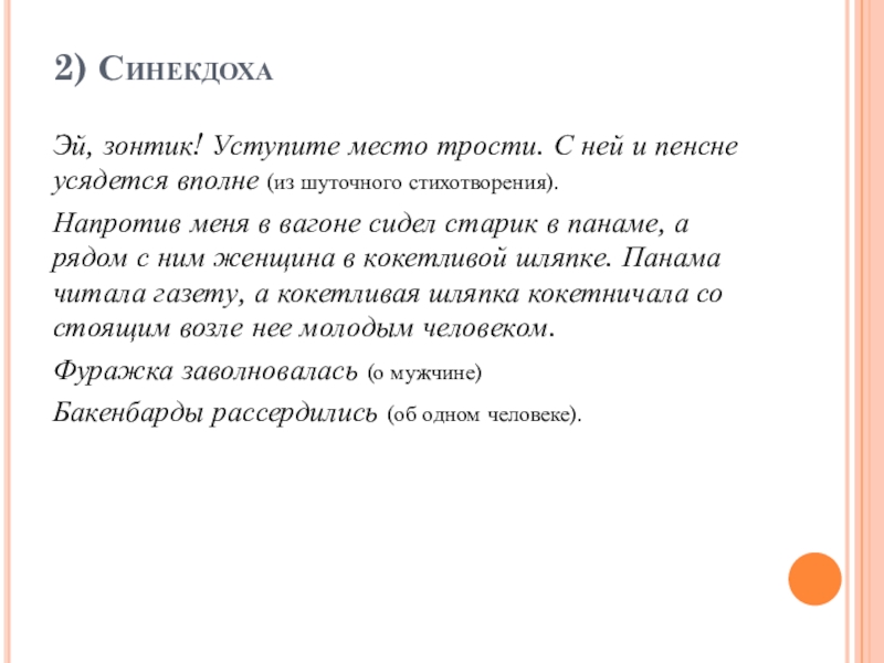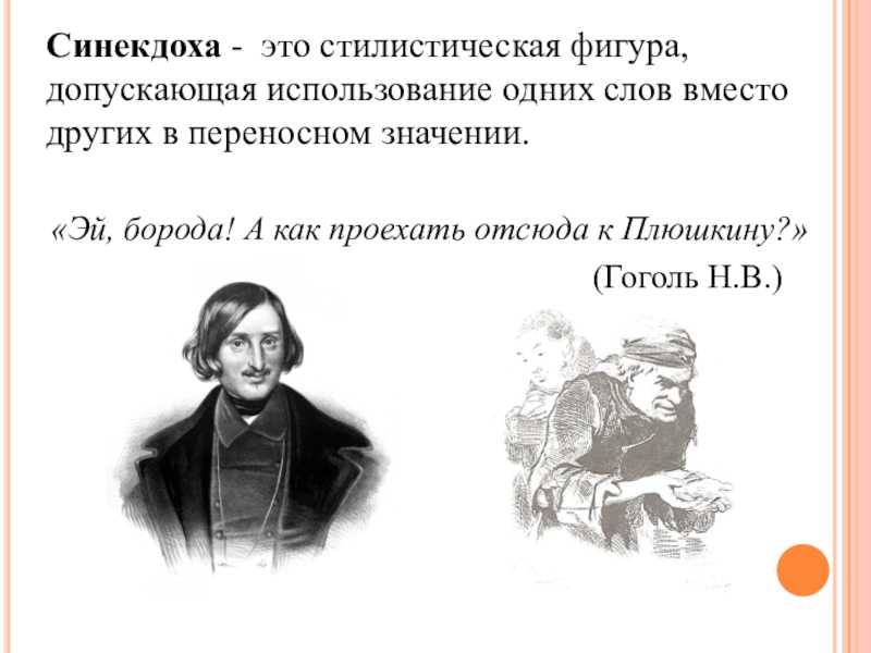 Слайд 7Синекдоха - это стилистическая фигура, допускающая использование одних слов вместо других