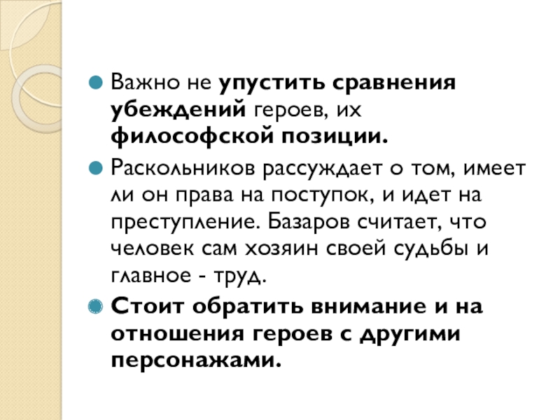 Слайд 6Важно не упустить сравнения убеждений героев, их философской позиции.